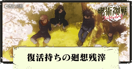 呪術廻戦ファントムパレード(ファンパレ)の復活状態持ち廻想残滓を紹介。廻想残滓(かいそうざんし)の効果や使い方をはじめ、レアリティやクールタイムなども一覧形式で掲載しているので参考にどうぞ。