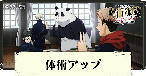 スキル1:【廻想】「勝つぞ」 自身に体術アップ20.0%付与(3ターン)スキル2:【オート】「勝つぞ」 バトル開始時、味方全体に体術10.0%アップ付与(Wave内の味方に特徴【呪術高専東京校学生】をもつメンバーが多いほど効果量アップ) |