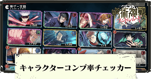 呪術廻戦ファントムパレード(ファンパレ)のキャラクターコンプ率チェッカーを紹介。キャラクターの所持率計算や、X(旧Twitter)への投稿(シェア)ができる。全キャラクター中の所持率だけでなく、レア度別のコンプ率も表示できるため参考にどうぞ。