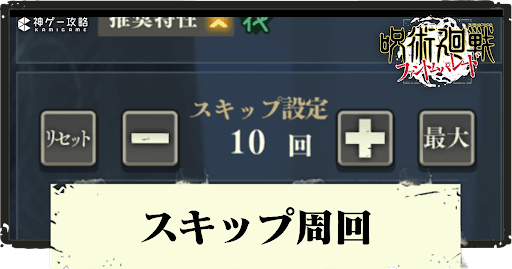 呪術廻戦ファントムパレード(ファンパレ)のスキップ周回を紹介。スキップ周回の方法と経験値効率の差、手順についても掲載しているので参考にどうぞ。