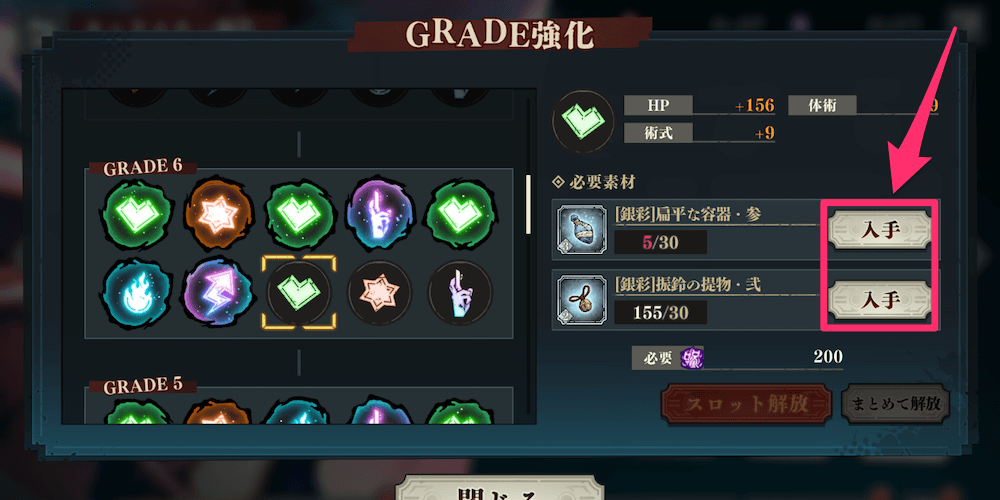 | 強化・編成→キャラクター強化→GRADE強化→入手 |