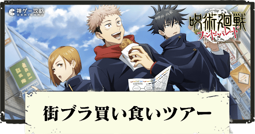 呪術廻戦ファントムパレード(ファンパレ)の「街ブラ買い食いツアー」(SSR)を紹介。街ブラ買い食いツアーのスキルとオートスキル、またスキルレベルごとの効果や個別のランキング、簡易評価についても掲載しているので参考にどうぞ。
