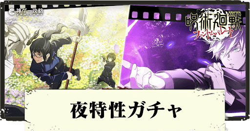 呪術廻戦ファントムパレード(ファンパレ)の、幻影夜行ガチャ(夜特性ガチャ)を紹介。排出対象の評価や排出確率についても掲載しているため、幻影夜行ガチャについて知りたい人は参考にどうぞ。