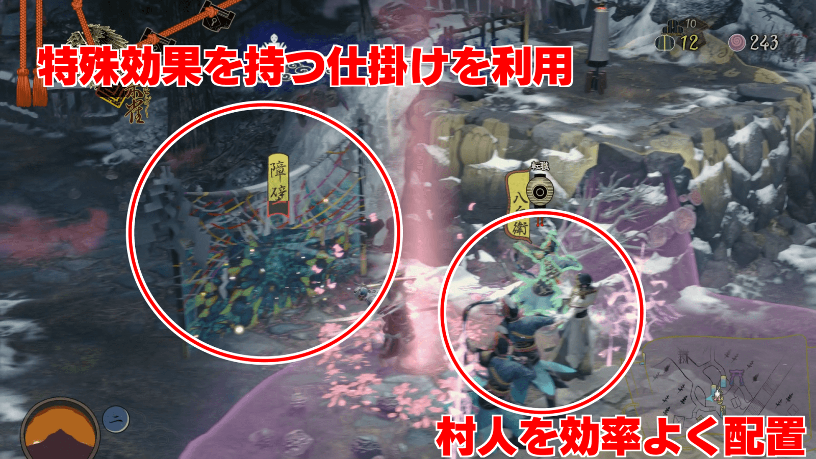 祇(くにつがみ)は、タワーディフェンスにおける戦略も重要な要素の一つ。穢れを祓った村人を特殊なスキルを持つ職業に転職させ、効率よく配置して畏哭に立ち向かおう。また、ステージには有利な効果を持つ仕掛けも存在するため、上手く活用すれば効率よく敵を倒せる。