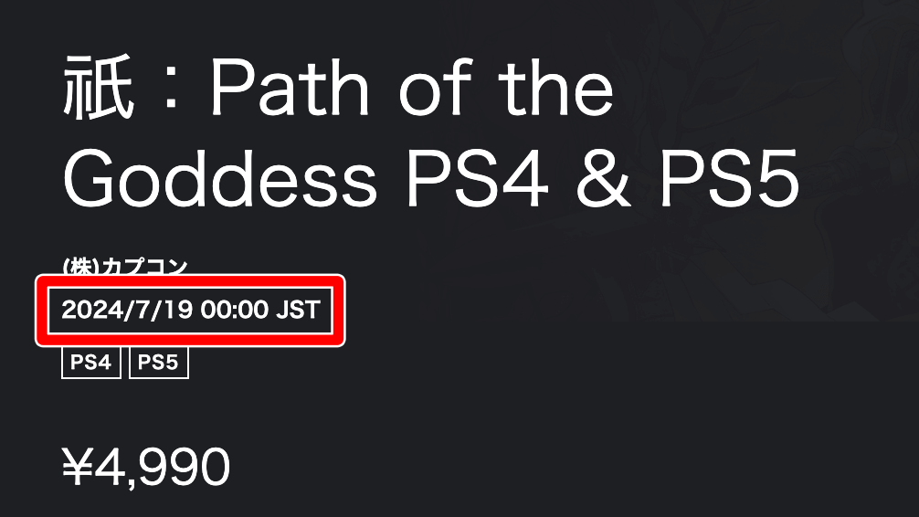 祇の価格は、4,990円だ。どのプラットフォームで購入しても値段は同じであるため、使用頻度の高いプラットフォームで購入して問題ない。