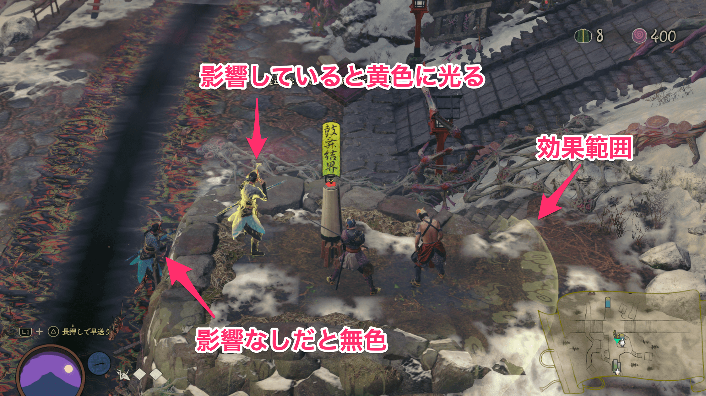 鼓舞結界は、効果範囲が円形に定まっているため、範囲内に村人を配置しよう。効果が適用されている村人は黄色に光っている。