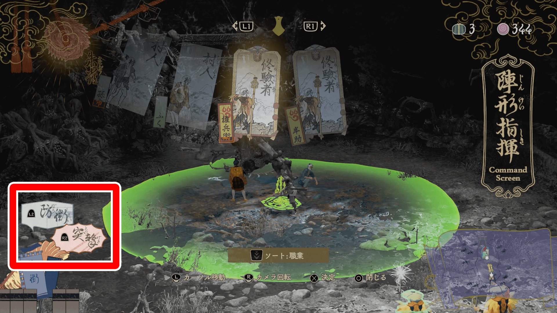 号令を使うと、村人全員に対して同じ指示を出せる。強力な畏哭との戦闘でのみ利用でき、攻撃や守りに特化した陣営を素早く組める。