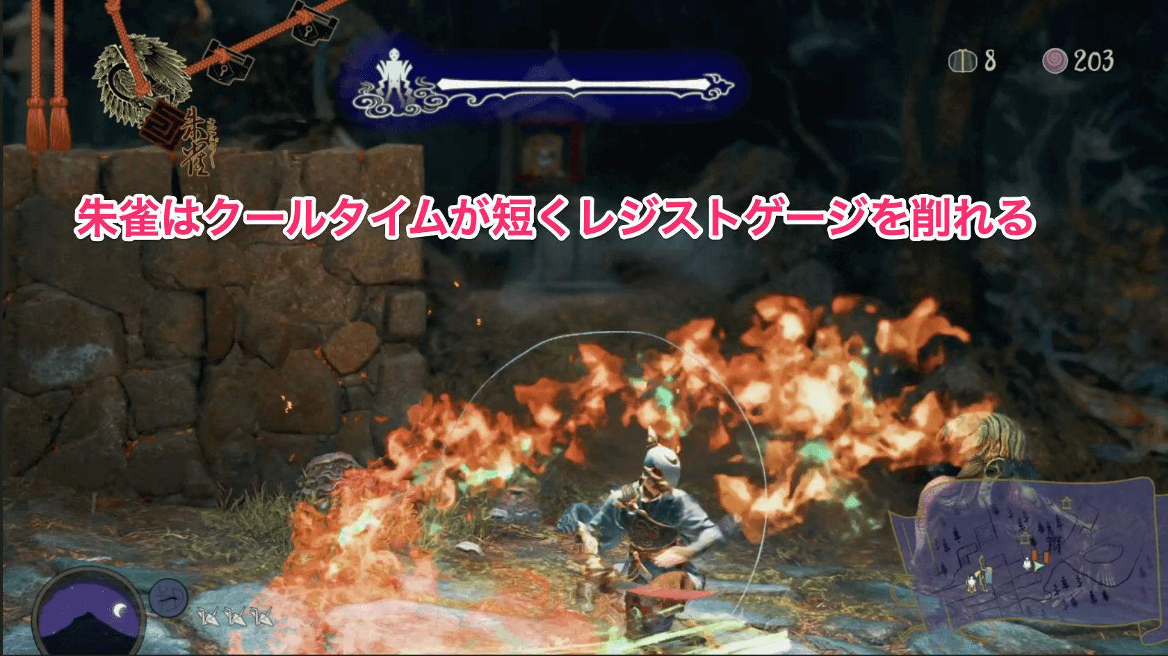 明光峠クリア後に入手地上の小範囲に二連撃を放つ。威力はそこそこだが、霊力回復速度が速く使いやすい。畏哭のレジストゲージを削る効果がある。 |