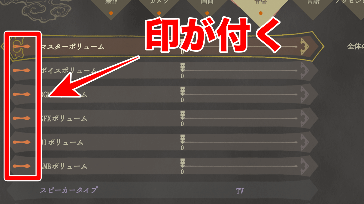 変更した項目には、オレンジ色の印が付く。また、デフォルト設定に戻したい時は、Rスティック押し込みで全項目をリセットでき、▢ボタンでカテゴリー内の設定をリセットできる。