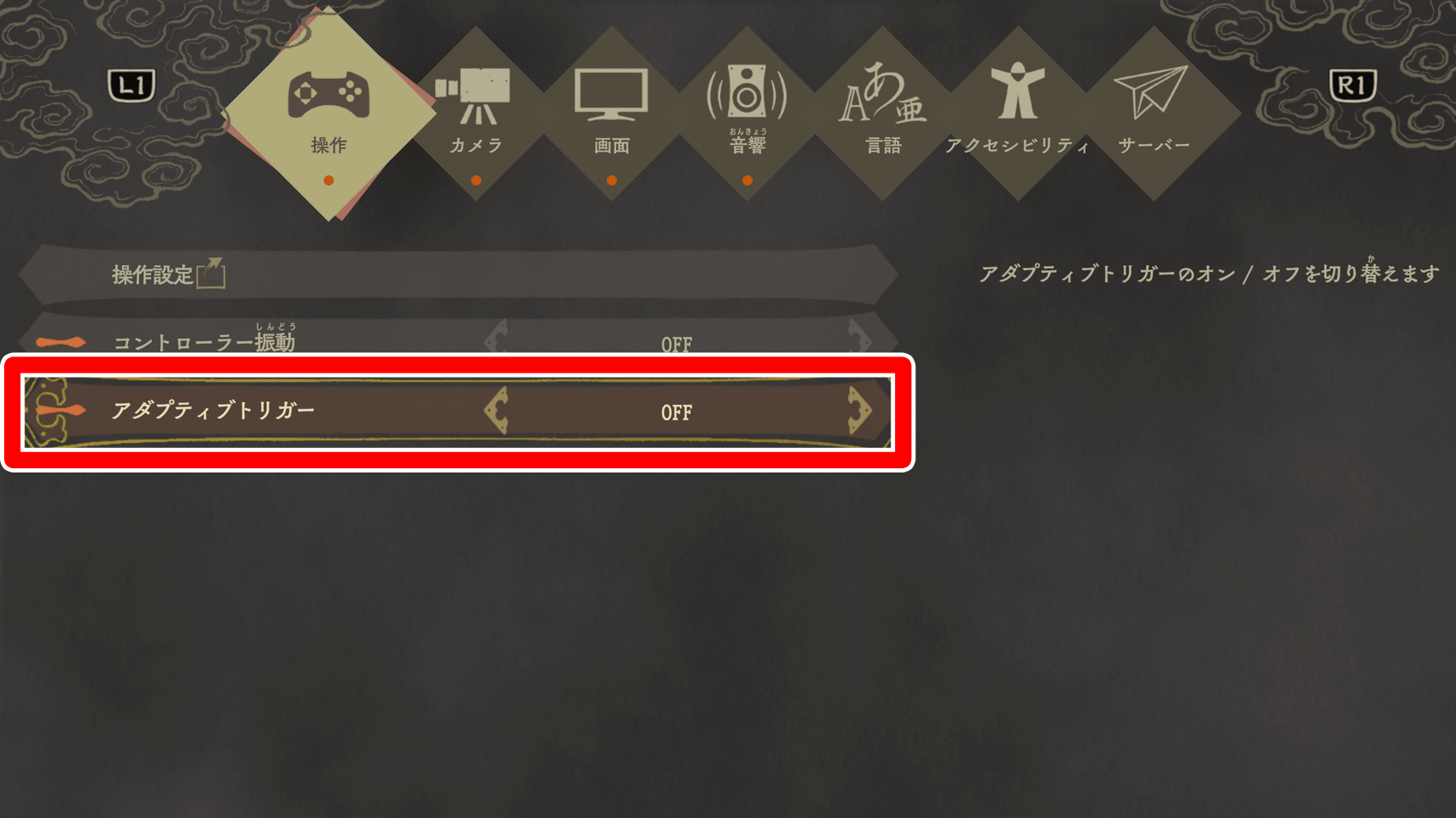 ゲームプレイを優先するなら、アダプティブトリガーはオフにするのが良い。アダプティブトリガーをオンにするとL1とR1の重みが増え、ボタンを素早く押しにくくなる。ゲームへの没入感を求めない場合は、オフにしておくのがおすすめ。