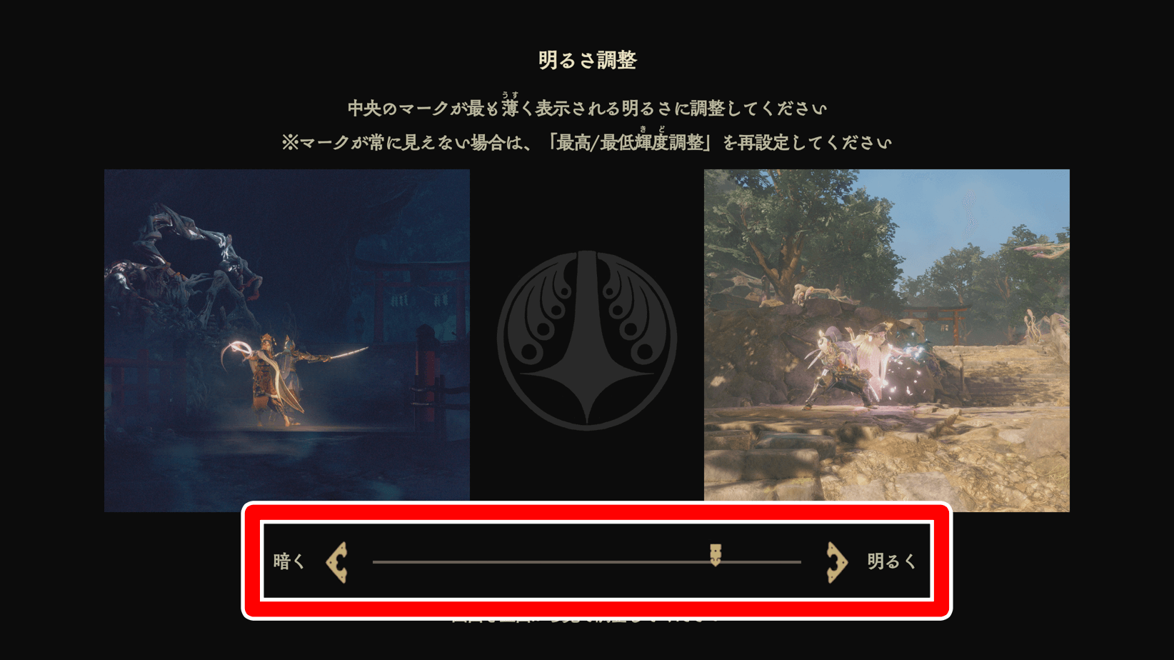 画面の輝度設定は、明るめに調整するとゲーム画面が見やすくなる。くにつがみの戦闘画面は暗めであるため、輝度調整で画面を明るくしておこう。