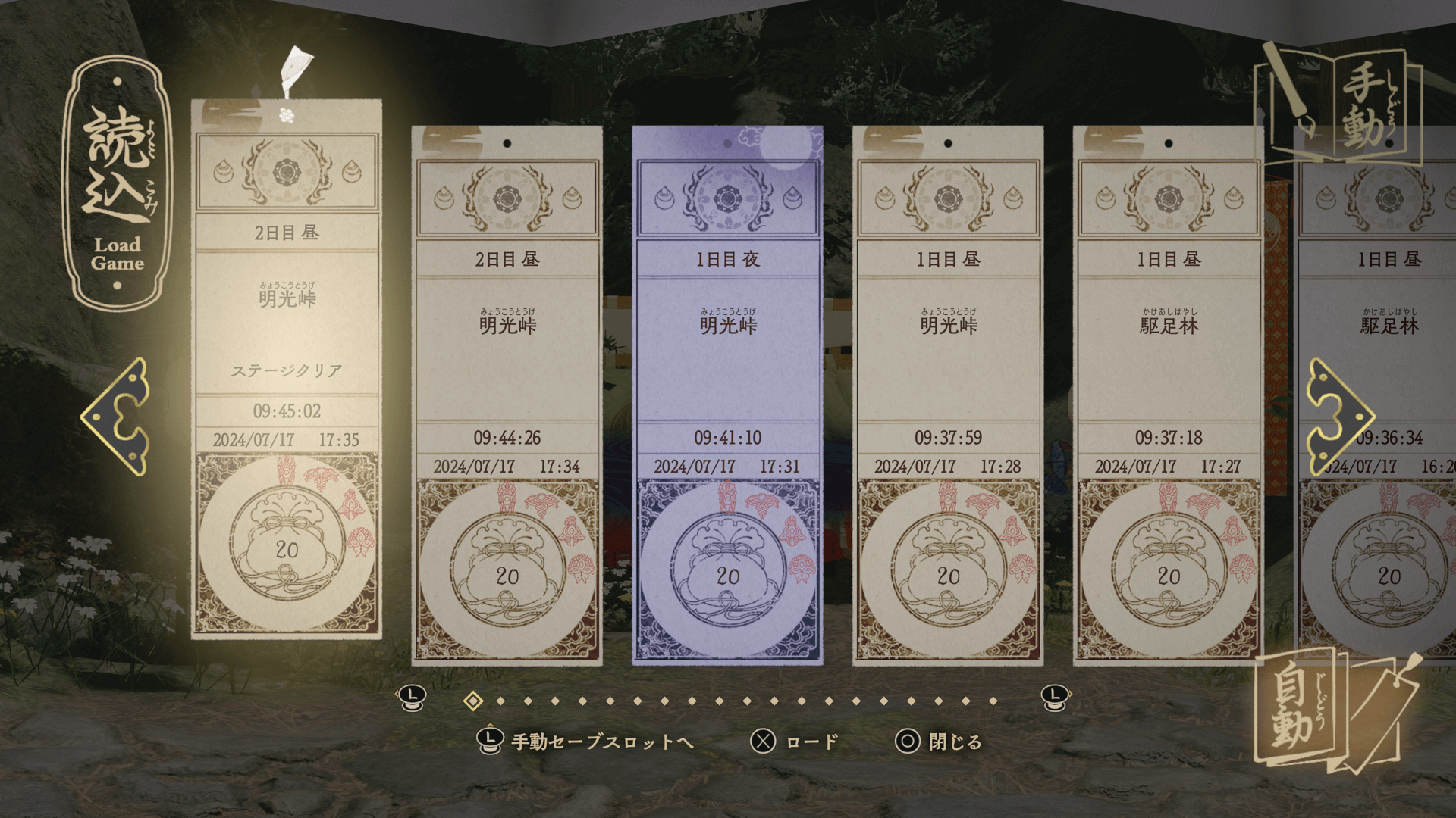メニュー画面のロードを選択すると、セーブデータの一覽が表示され、選択したデータでゲームを進められる。セーブデータには日時やステージ名が記載されているので、ゲーム進捗を目安に目当てのデータを探してロードしよう。