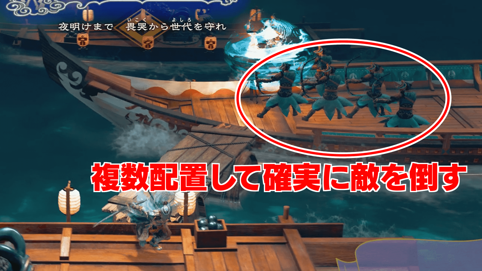 火縄は、近い位置に複数配置し、火縄部隊を作るのがおすすめ。火縄を複数配置すれば、中型以上の畏哭も一瞬で倒せるため、宗のフォロー無しで畏哭の侵攻ルートを任せられるようになる。