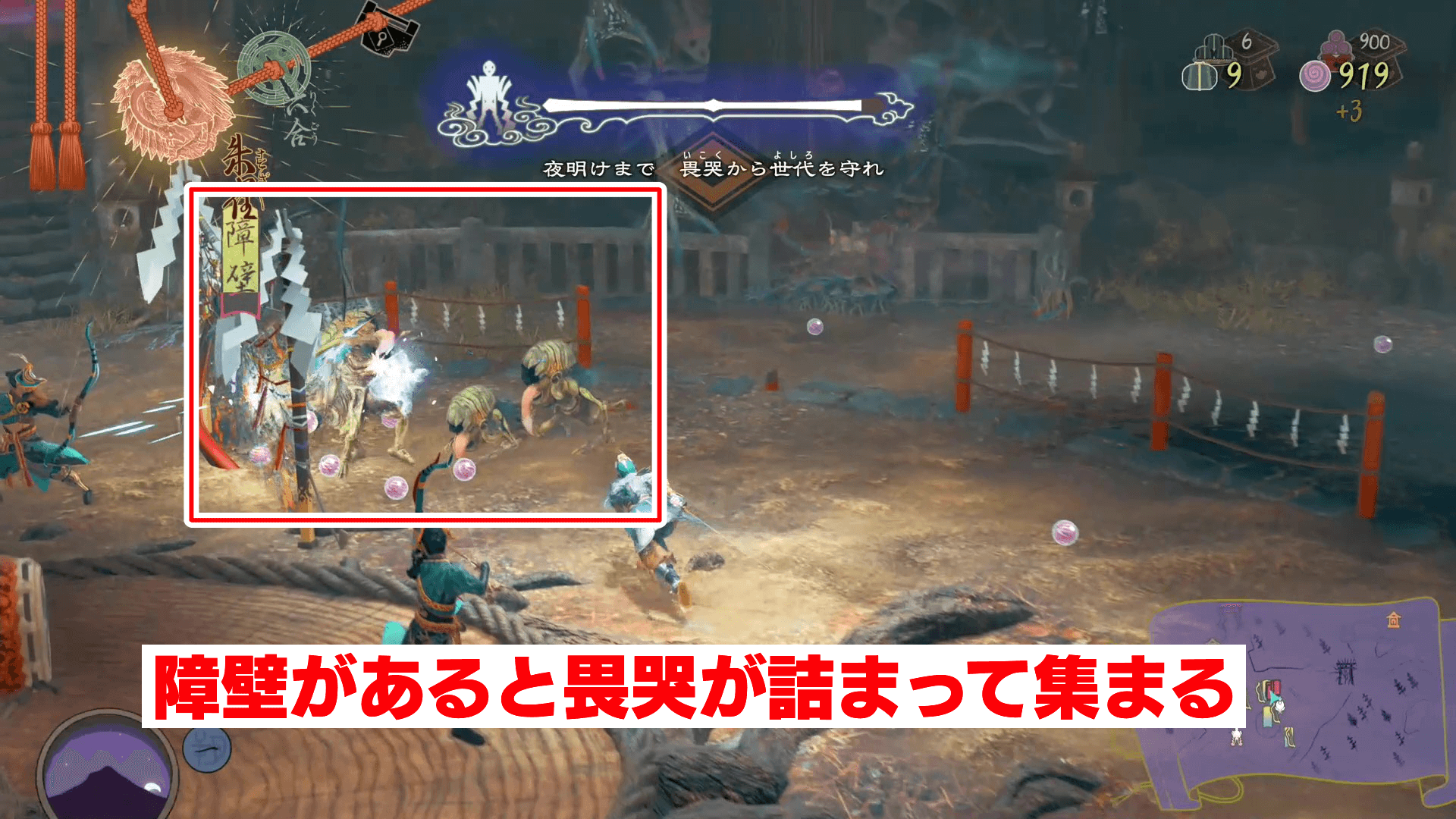 畏哭の呪炎化を同時に10体解除するには、前半の広場で障壁前に集まった畏哭を解除するのがおすすめ。障壁に引っかからないルートで来る畏哭もいるが、太鼓は効果範囲が広いため、まとめて解除できれば達成しやすい。