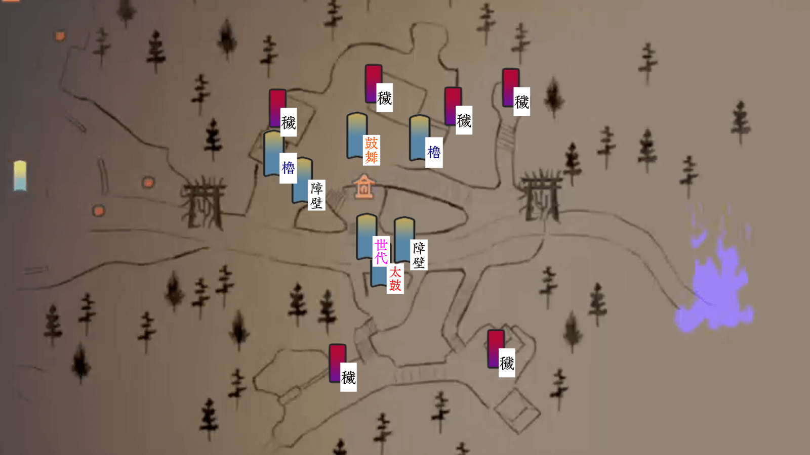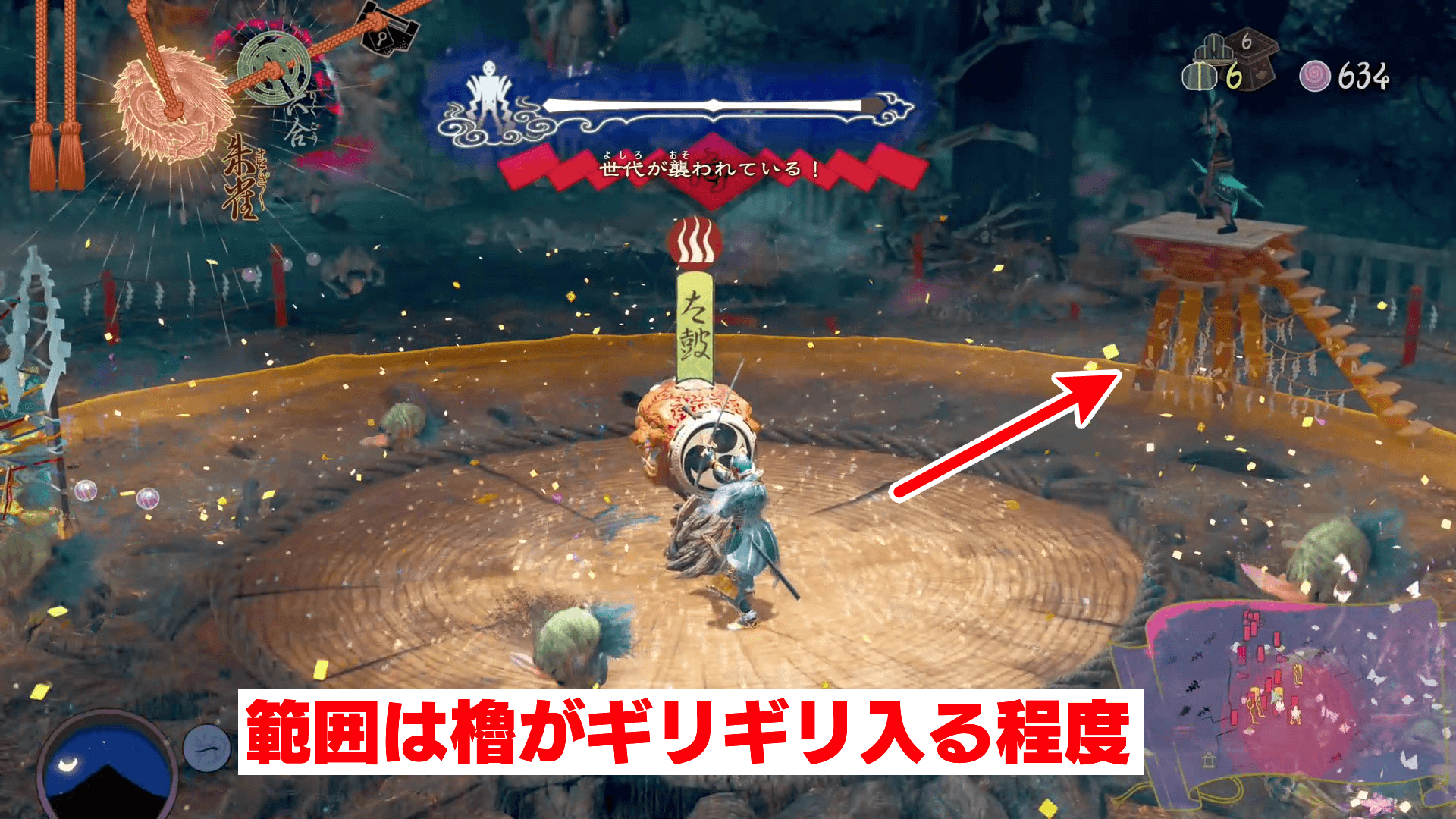 ろうそく老によって呪炎化した敵は、中央に設置された太鼓を叩くと解除できる。太鼓の範囲は障壁や櫓が入る程度には広いため、呪炎化した畏哭が広場まで入ってきたら太鼓を使おう。