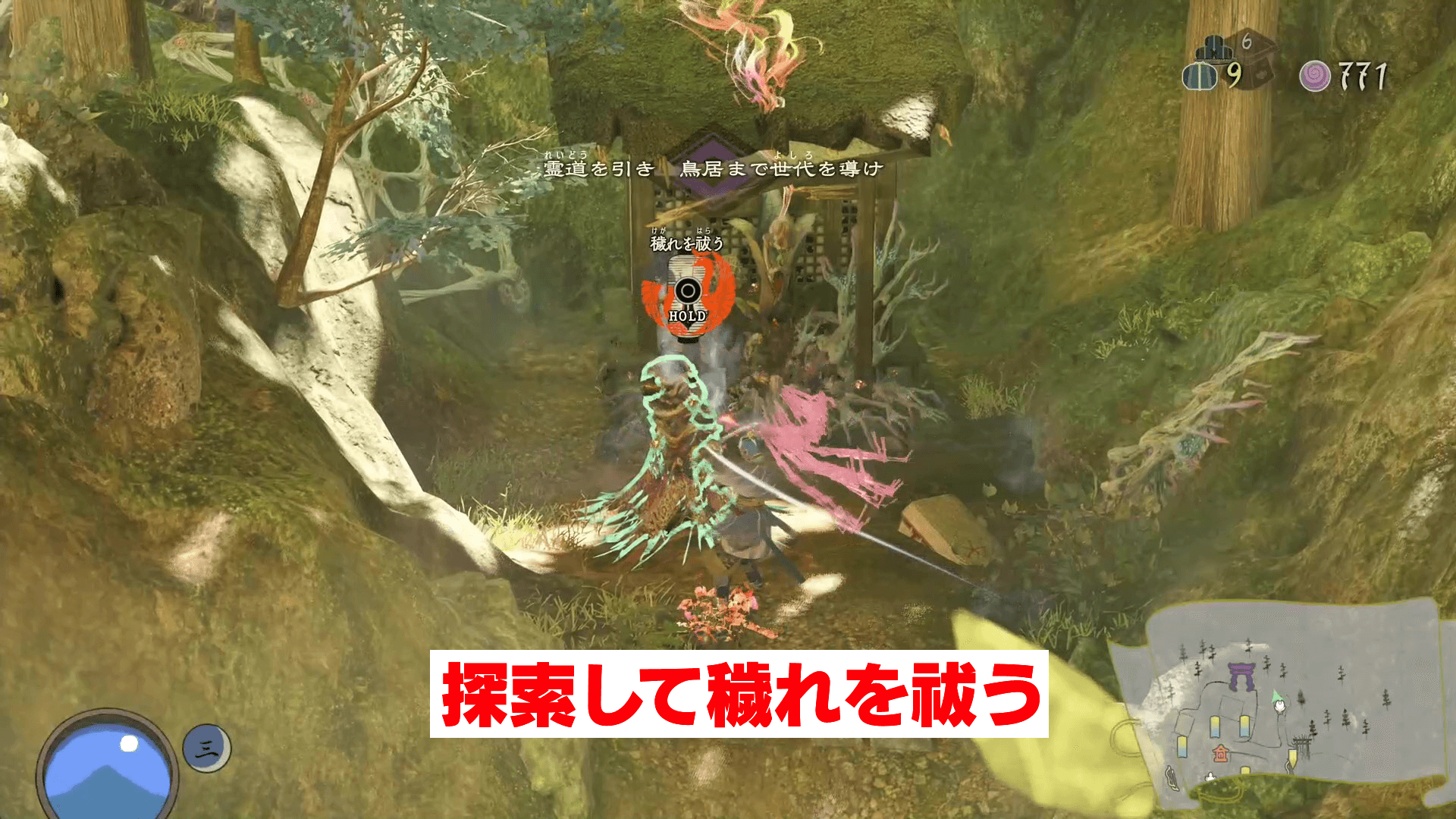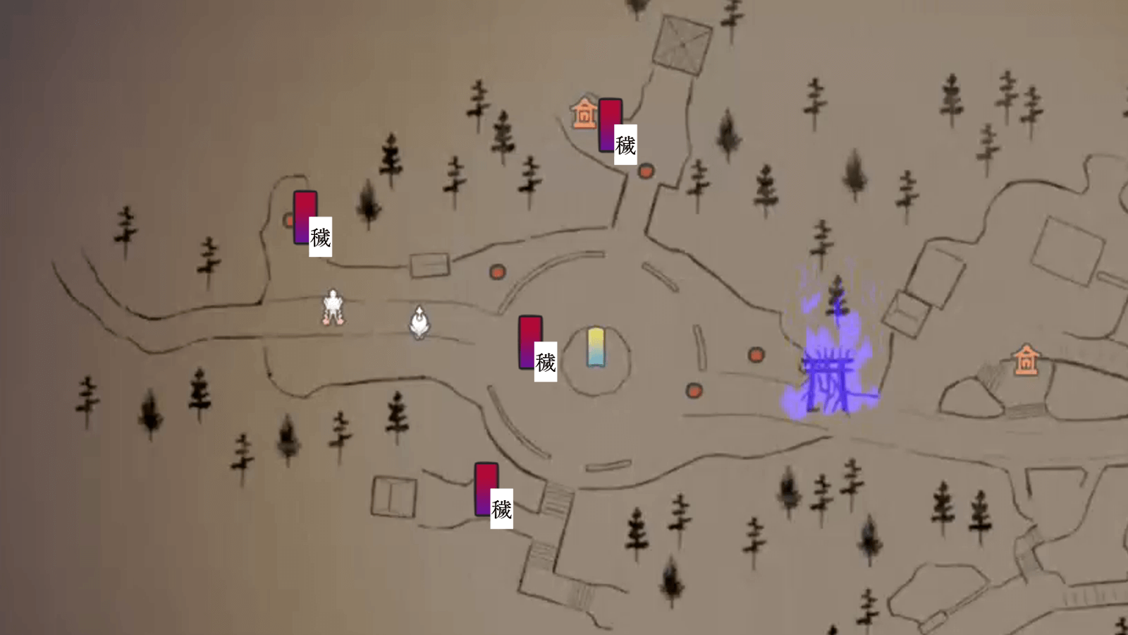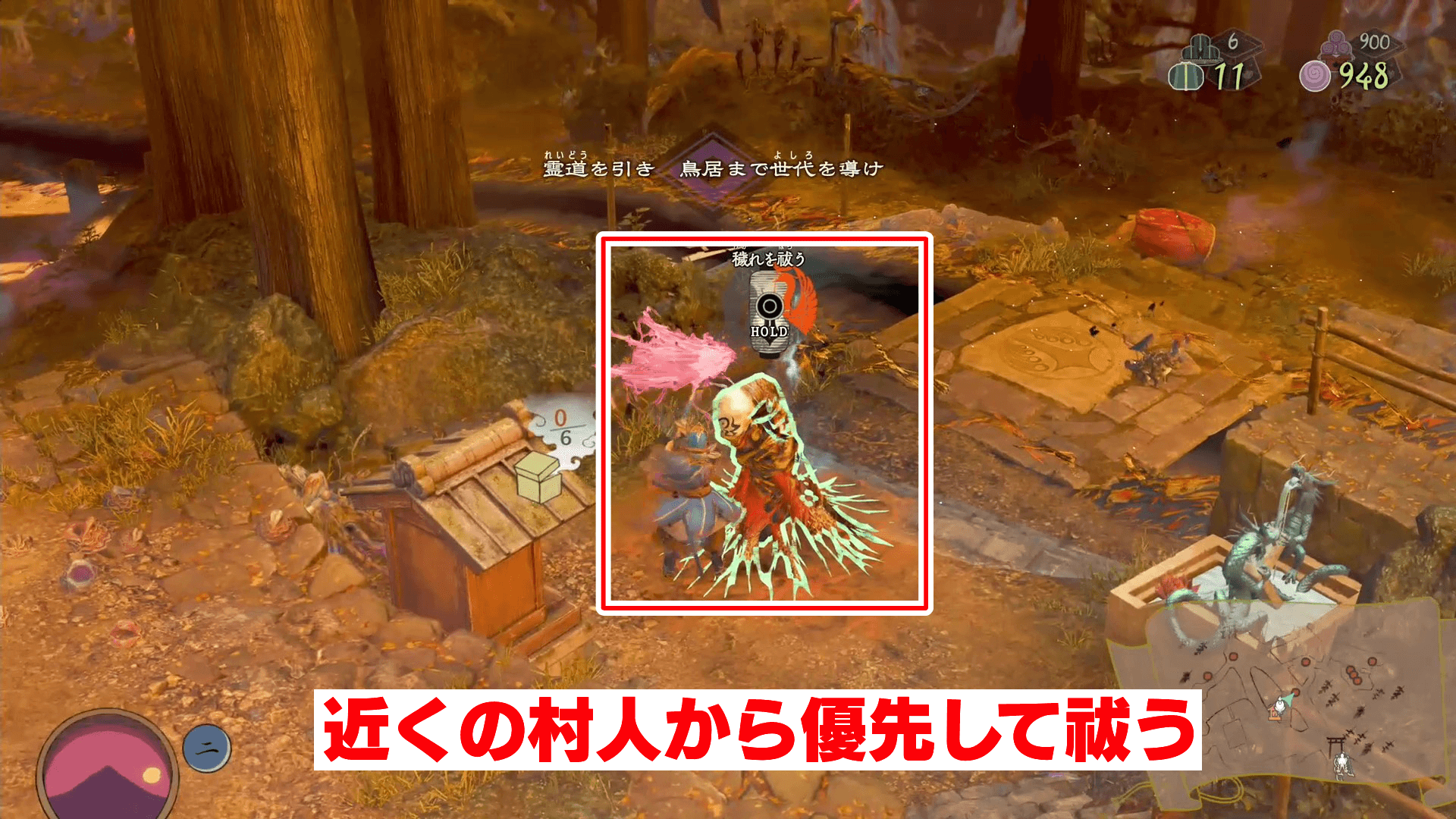 化野村では、開始地点のすぐ左側にいる村人を見落としやすいので注意。他の村人や穢れは開始地点よりも前にあるため、まず左側の村人を祓ってから広場の方へ進もう。