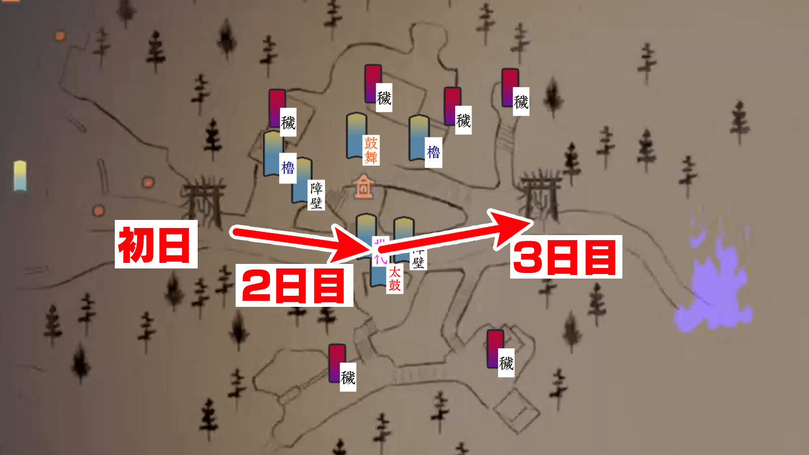 後半初日は時間がないので霊道を引かず、後半2日目になったら世代を結界内まで進めて待機させよう。世代結界まで進めてしまえば、次の日で穢れ鳥居まで到達できる。世代結界の正面には障壁があり、高台には櫓と鼓舞結界もあるため、仕掛けを修理できていれば守りやすい地形だ。