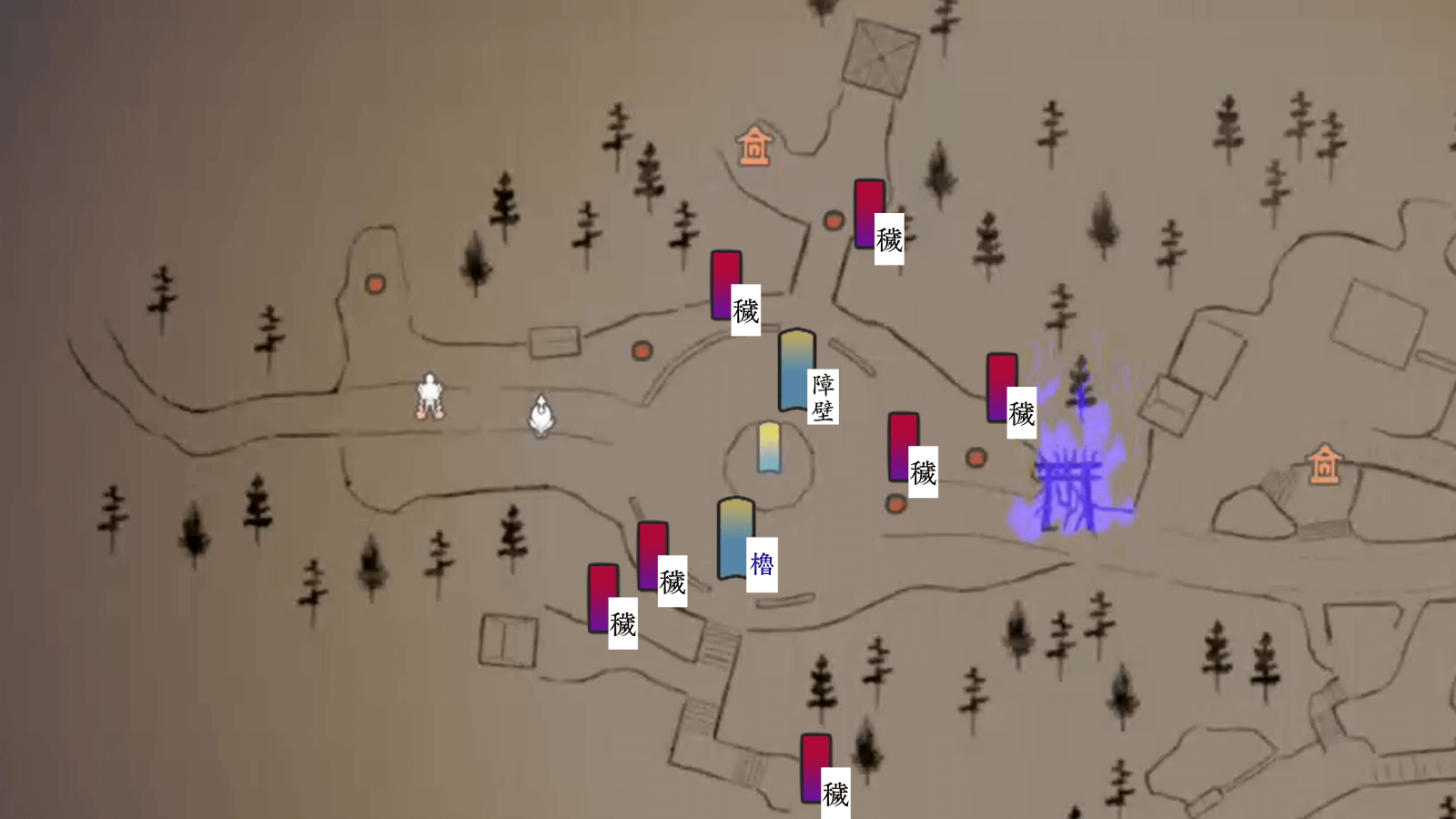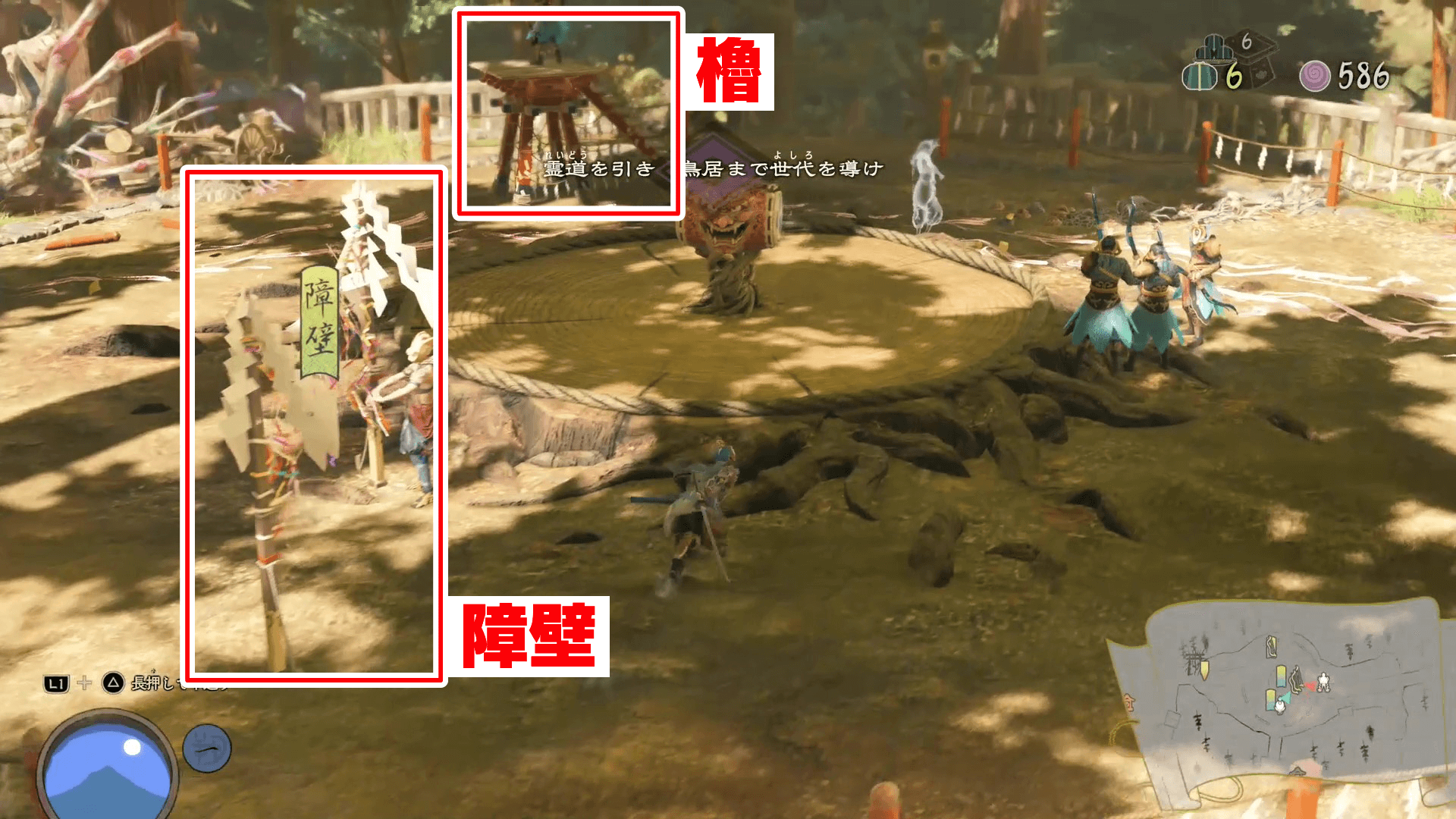 化野村前半では、櫓と障壁を必ず修理しよう。中央の太鼓の両隣に壊れた櫓と障壁が1つずつあり、他の仕掛けは無い。障壁も櫓も無ければ畏哭が素通り出来てしまうため、忘れずに修理しておこう。