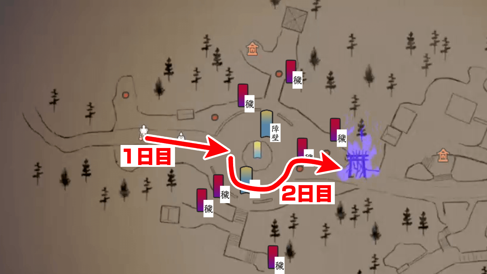 1日目の世代の位置は、開始地点から見て広場の入口の辺りで待機させるのがおすすめ。櫓側を通って鳥居まで進むため、正面に障壁を置けない点に注意。広場の入口付近まで進めておけば、次の日のうちに1つ目の穢れ鳥居まで到達できる。