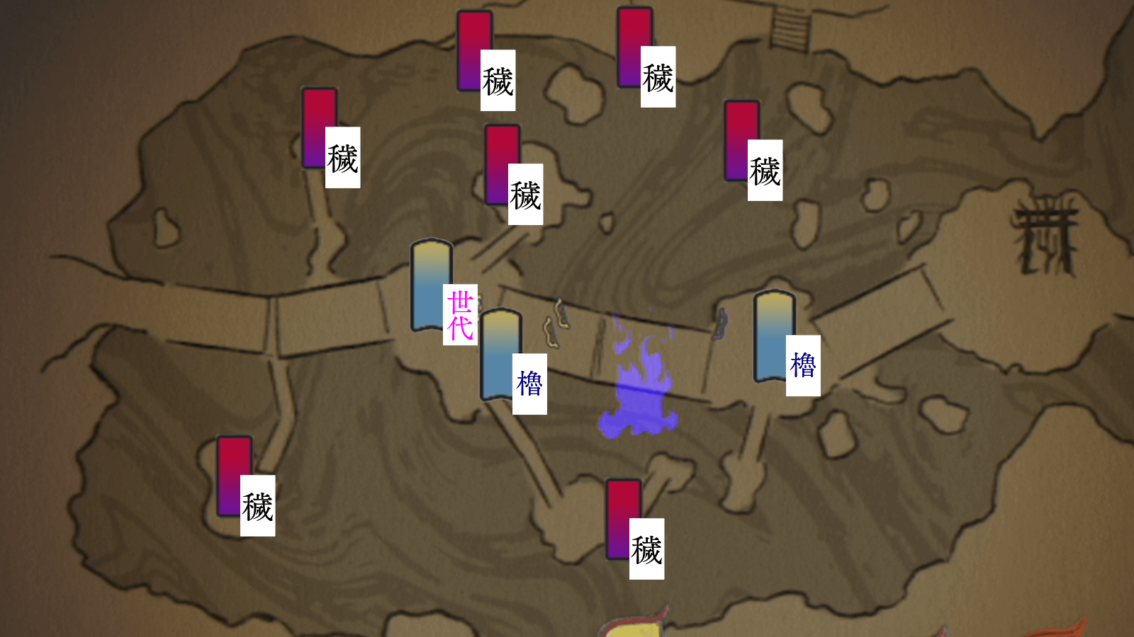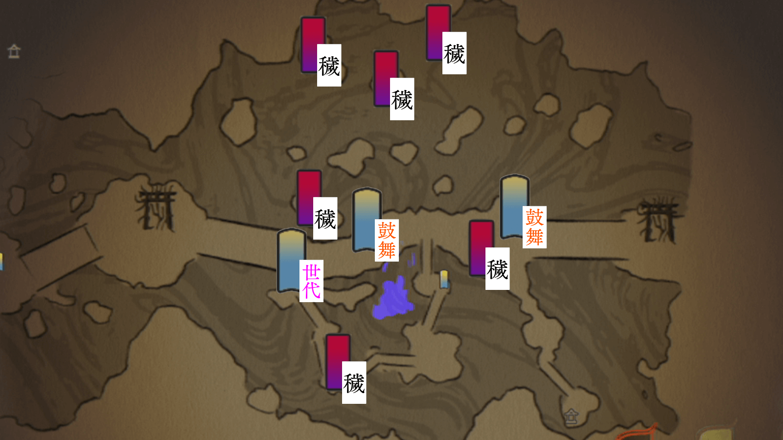 鳥居(一)までの穢れ6個を払う生存している村人が一人もいない場合、宗が畏哭から狙われやすくなる。 |