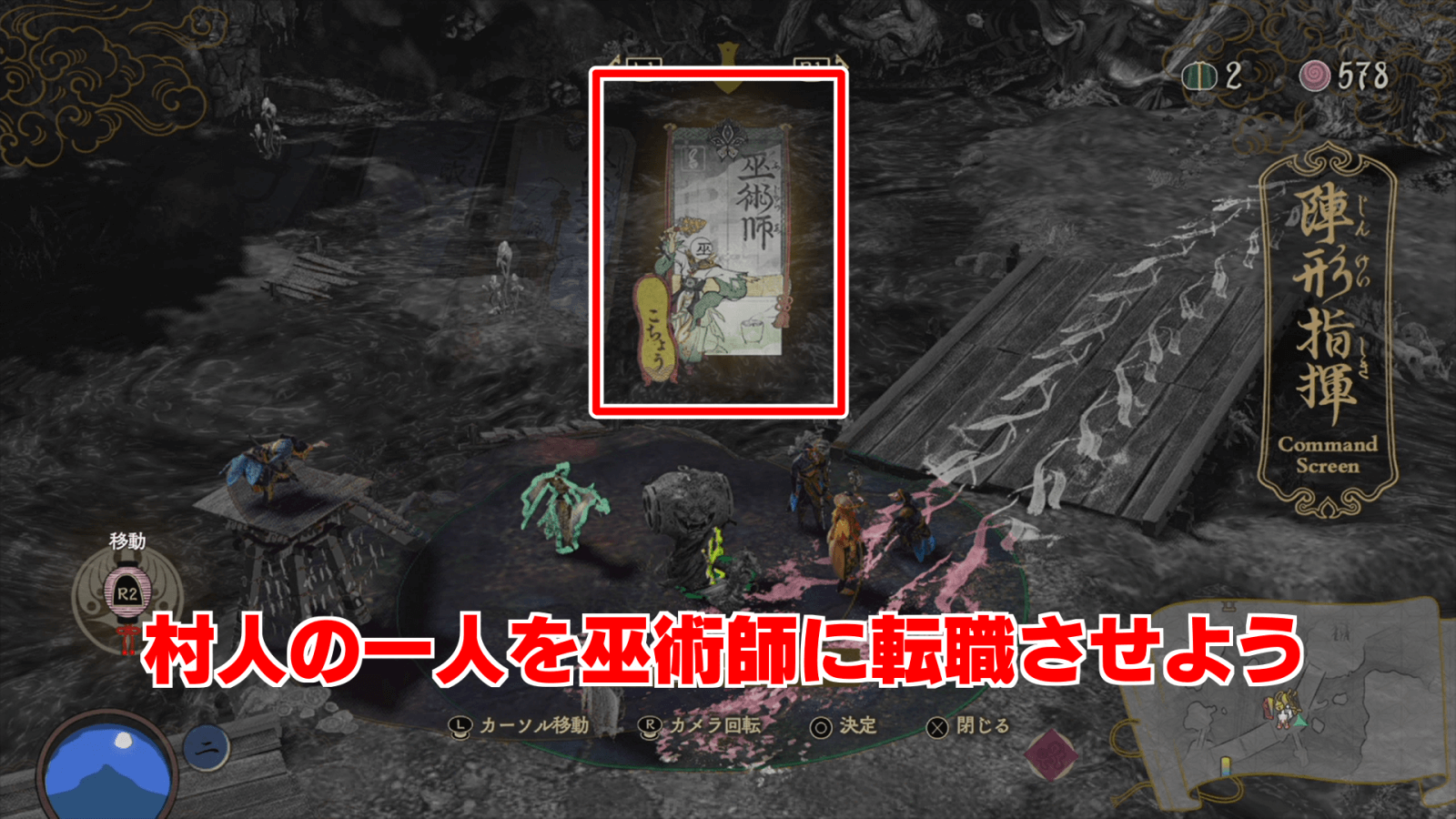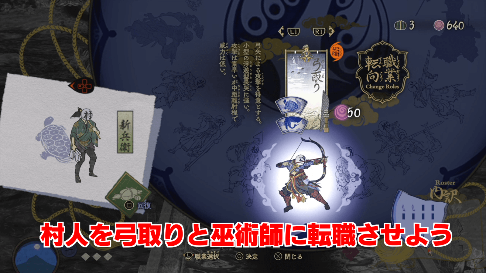 蓮華沼攻略の際は、まず村人を解放して弓取りと巫術師に転職させよう。特に、蓮華沼では食料が一切手に入らないため、村人を回復できる巫術師が活躍してくれる。結晶に余裕がある場合は、弓取りの枠を射程と攻撃力がより優れている火縄にすると良い。