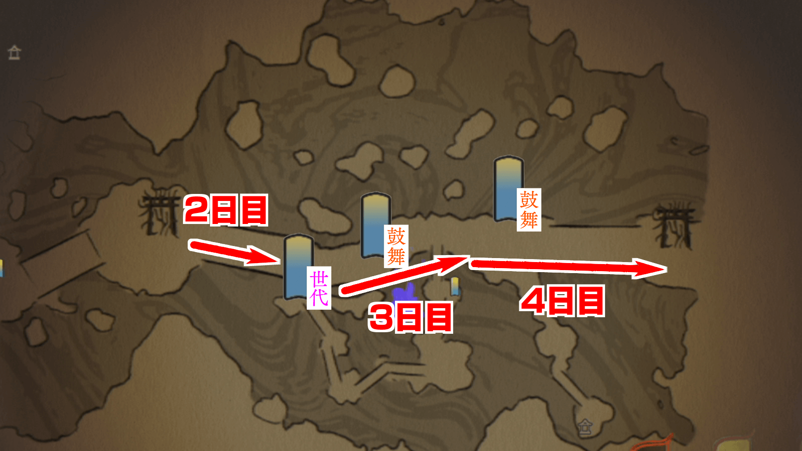 後半エリアでは、橋の修理に時間がかかるため、3回に分けて世代を移動させよう。2日目は入口付近もしくは世代結界まで世代を移動させ、3日目は鼓舞結界の間に世代を配置させると良い。