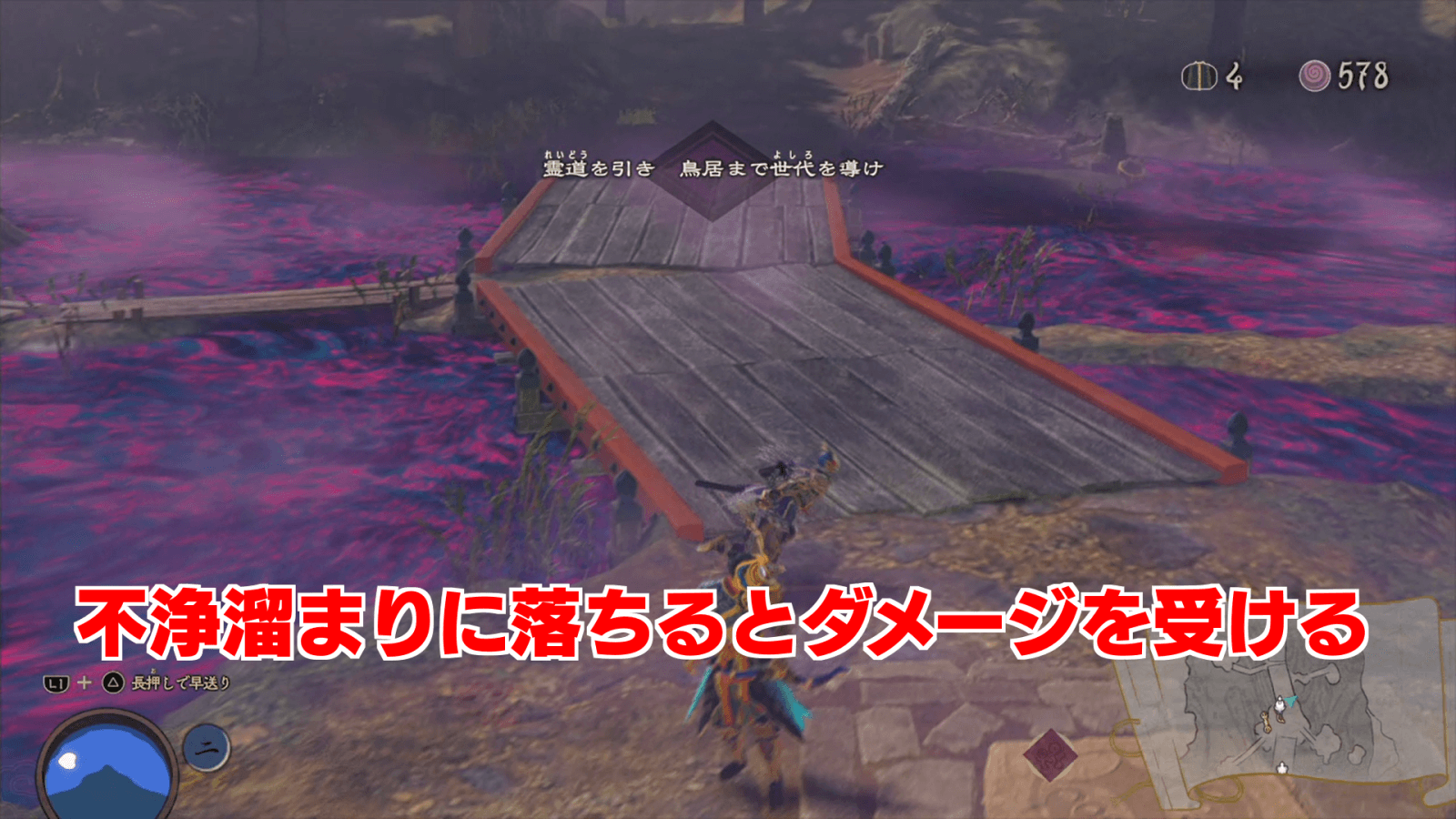 蓮華沼にある不浄溜まりに落ちるとダメージを受けてしまうため、なるべく不浄溜まりに落ちないようにしよう。不浄溜まりにいる敵には遠距離攻撃が有効なので、宗に弓術を覚えさせておくのがおすすめだ。不浄溜まりのダメージを減らす魔像「神行」を持っている場合は、装備しておくと良い。