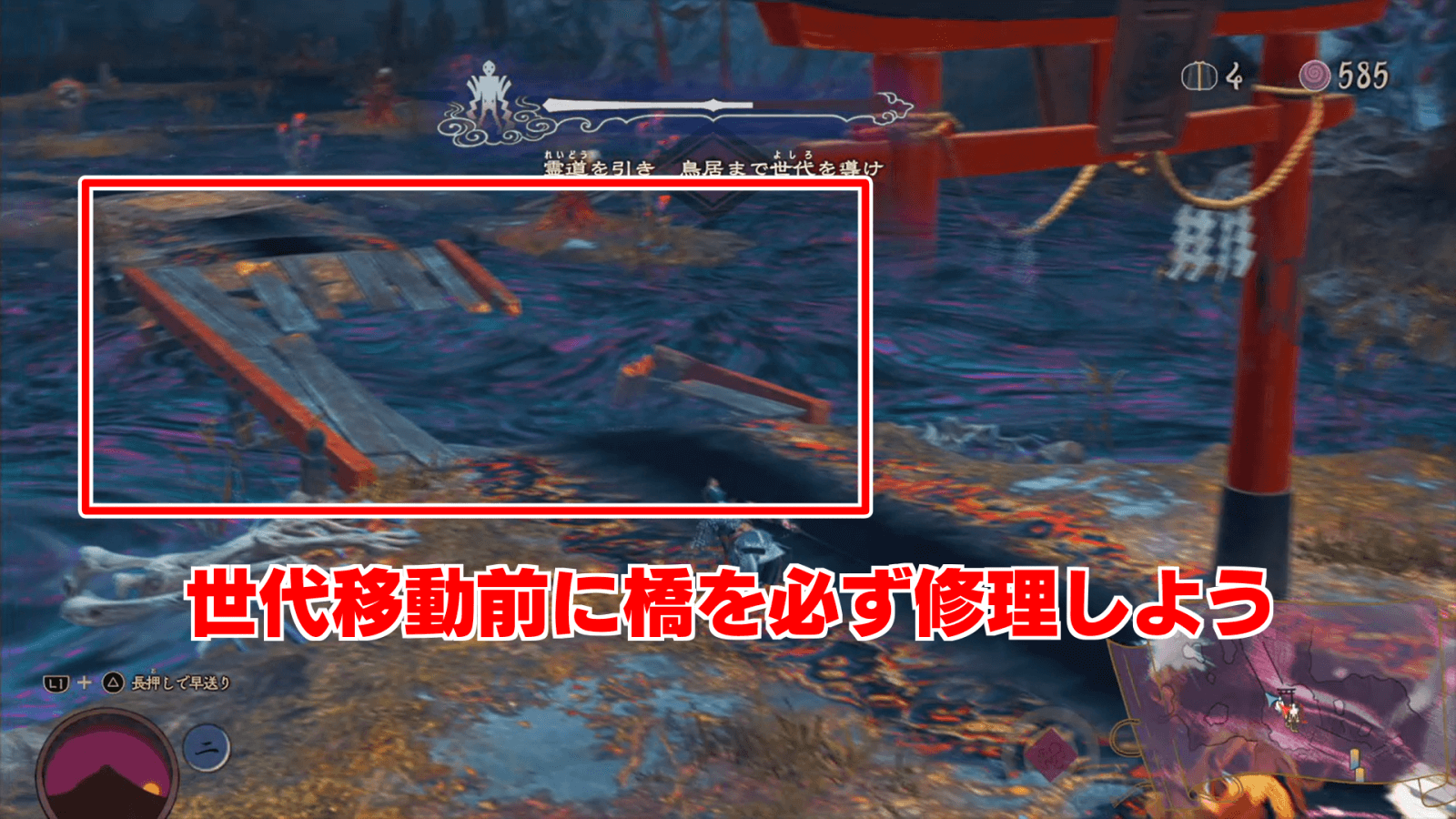 蓮華沼の攻略においては、2回に分けて世代を移動させよう。1日目は世代結界の先端付近に世代を配置し、2日目で一気に鳥居まで移動させるのがおすすめ。ただし、世代の移動が間に合わなそうな場合は、2日目は中央の橋付近に世代を止めておくのが良い。