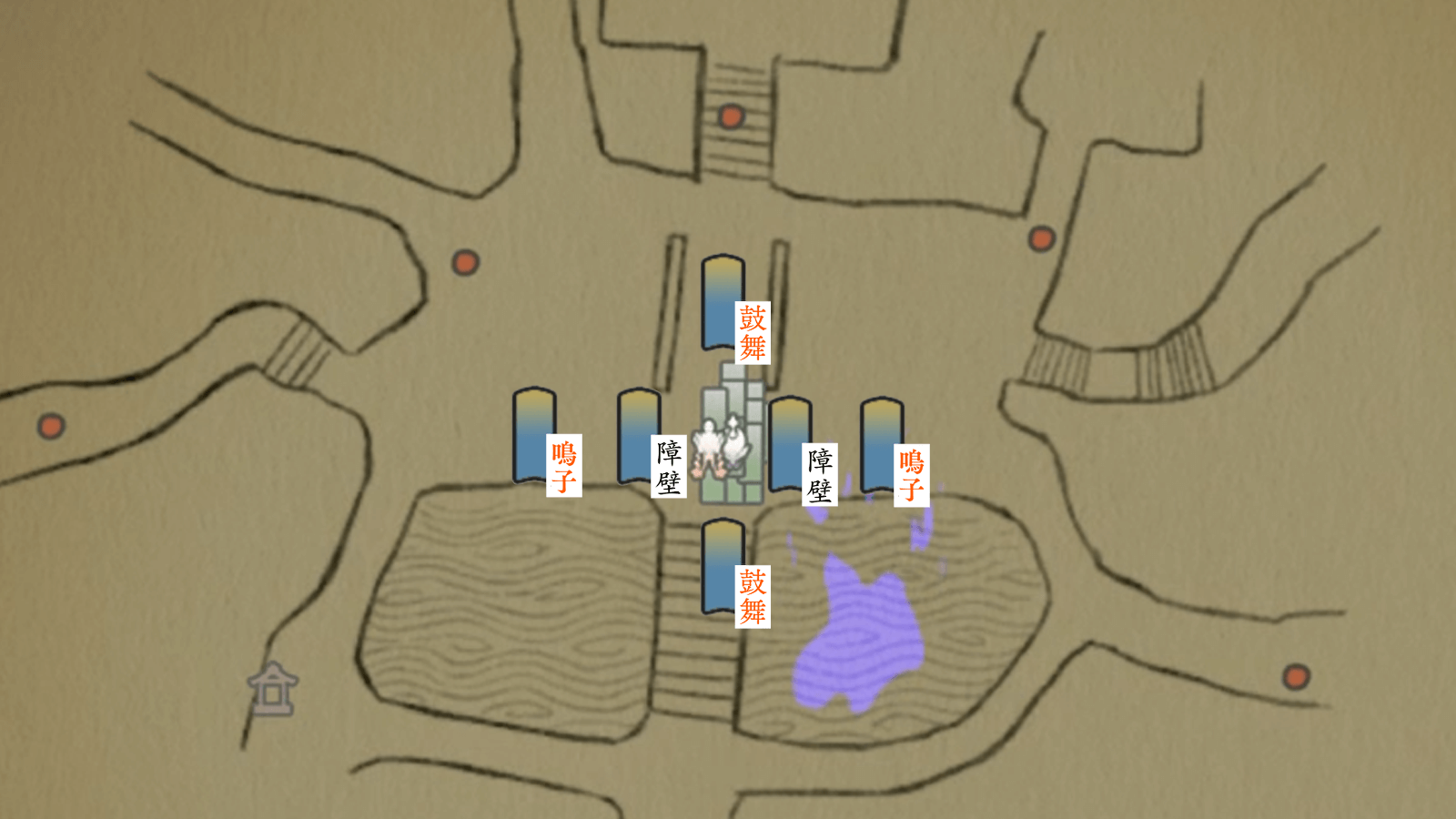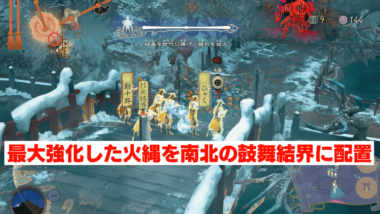 神座神社では、世代の倒れている場所付近にある仕掛けを修理しよう。特に、南北の鼓舞結界は最優先で修理し、火縄を配置するのがおすすめ。また、東西の障壁と鳴子を修理しておくと、火縄が敵を処理するまでの時間を稼ぎやすくなる。