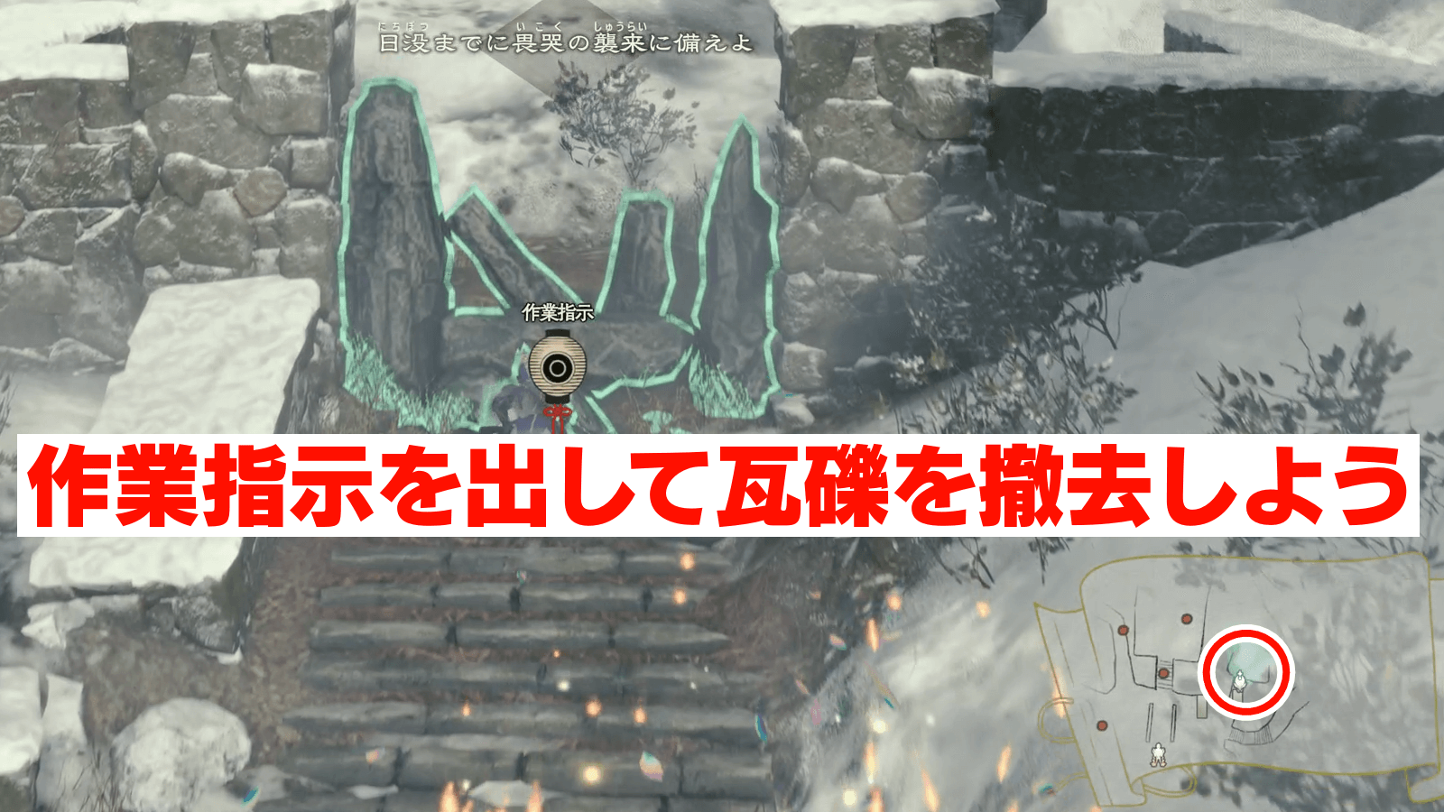 マップ右上には瓦礫があるため、早めに作業指示を出しておこう。作業には3人必要であり、瓦礫の撤去が終わるまでには時間がかかるため、ステージ開始後すぐに指示を出せると良い。