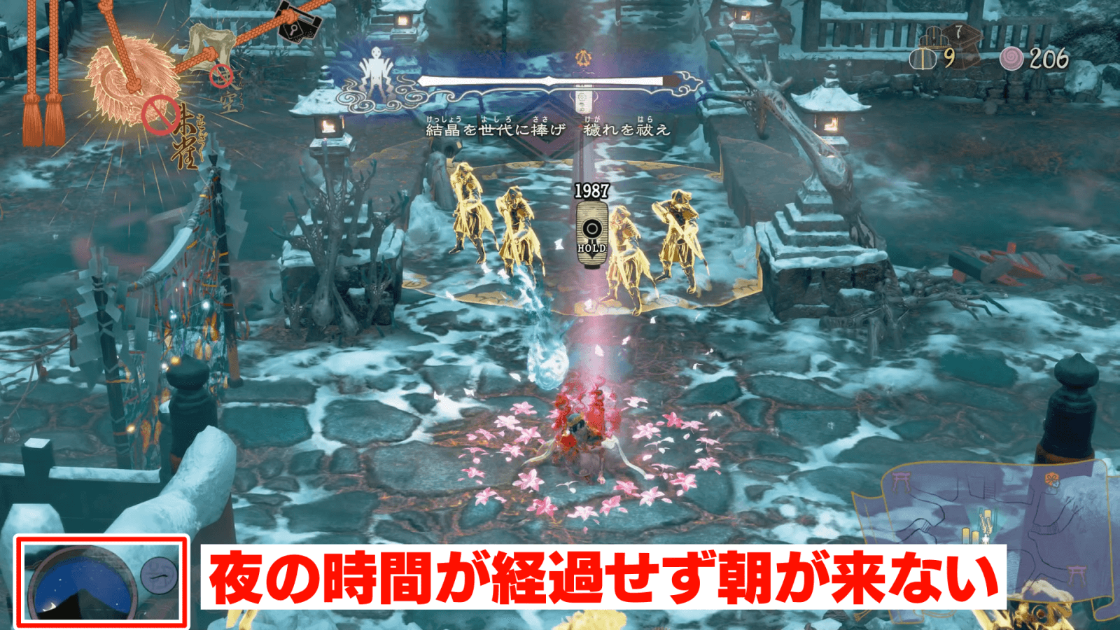 神座神社では朝にならないので、村人の解放を含め、昼の間にすべての穢れを祓おう。解放した村人の数が少ないと、防衛が難しくなるため、村人の解放を最優先に行うと良い。