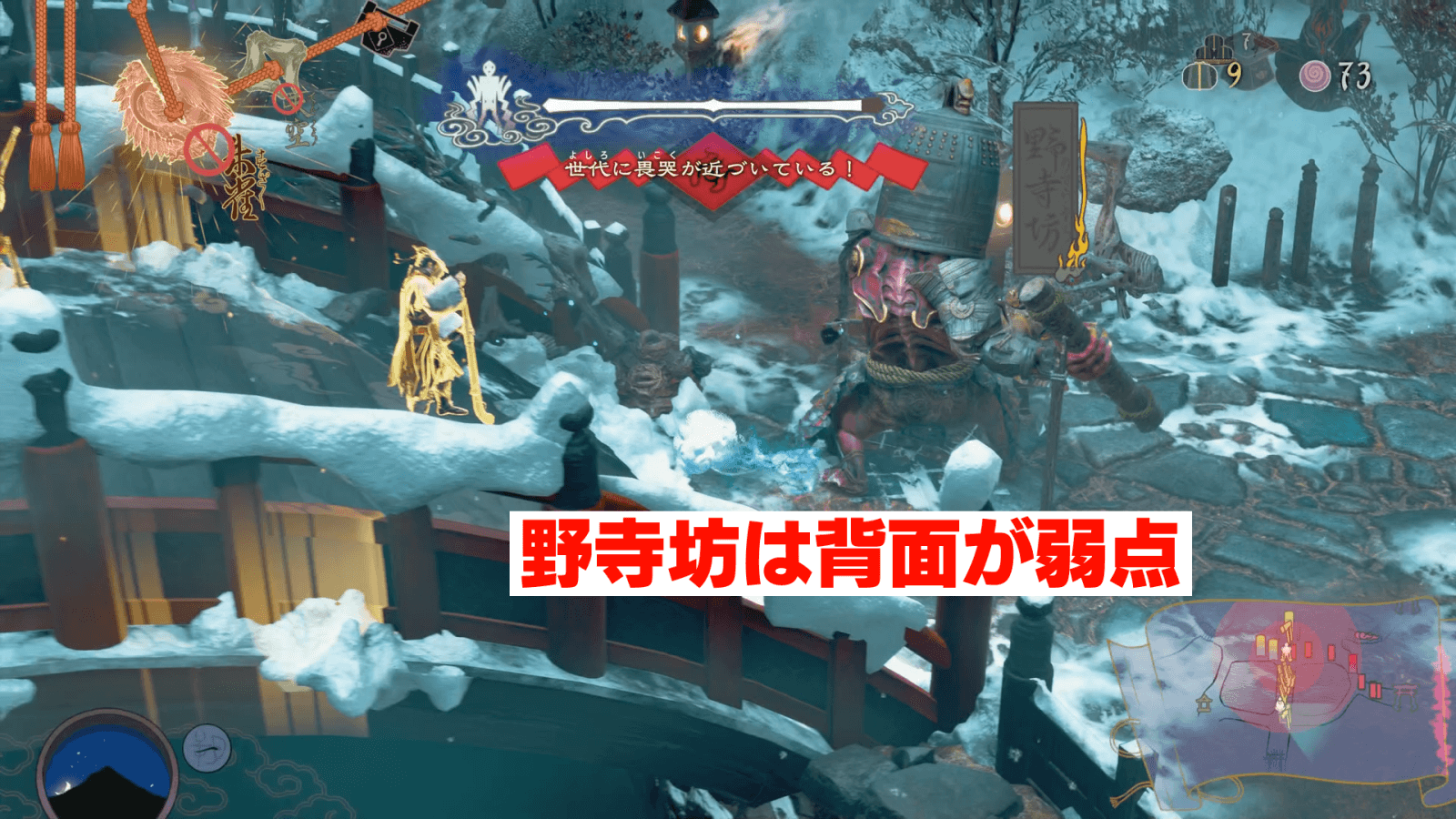 南の穢れ鳥居から野寺坊が出たら、近接職業を向かわせよう。野寺坊は背面が弱点であるため、火縄のみで正面から射撃してもダメージを与えにくい。近接職業を向かわせると、野寺坊が弱点である背面を晒すので、一気にダメージを与えて処理可能だ。