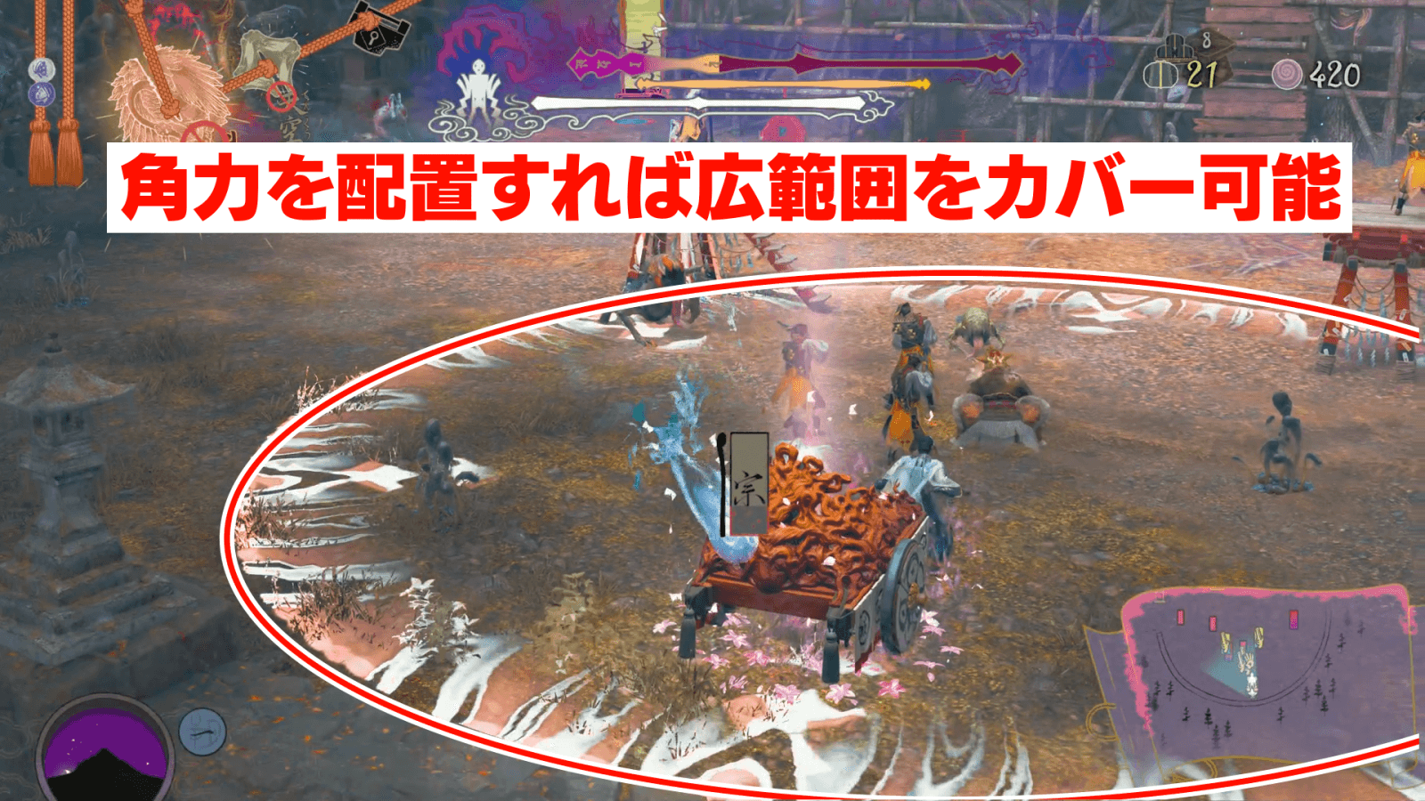 中原之大桜では、マップ全域に落下してくる穢れから敵が出現してくるため、火縄と角力を世代の周りに配置しよう。落下してきた穢れを即座に壊せば敵が出現しないが、村人は6人しかいないため、全域をカバーできない。火力が高い火縄5人と、範囲攻撃可能な角力1人で守る戦法がおすすめだ。