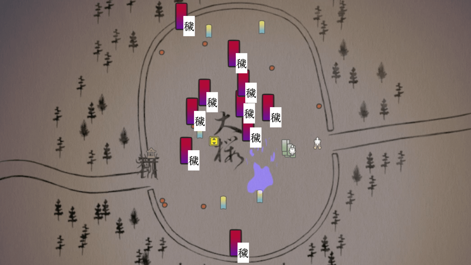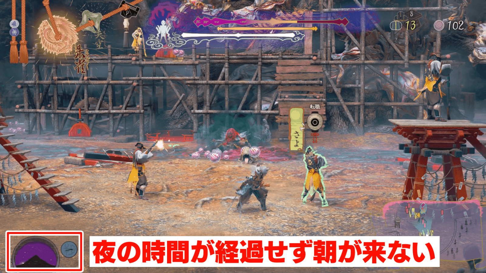 中原之大桜では朝が来ないため、1日ですべての穢れを祓おう。1度夜になると、ステージクリアまで夜が明けないので、1日目での全村人の解放と穢れ祓いが必須だ。