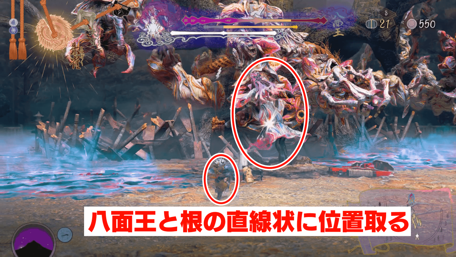 | 出現した根に八面王の突進を2回ぶつける八面王と根の直線上に位置取ろう |