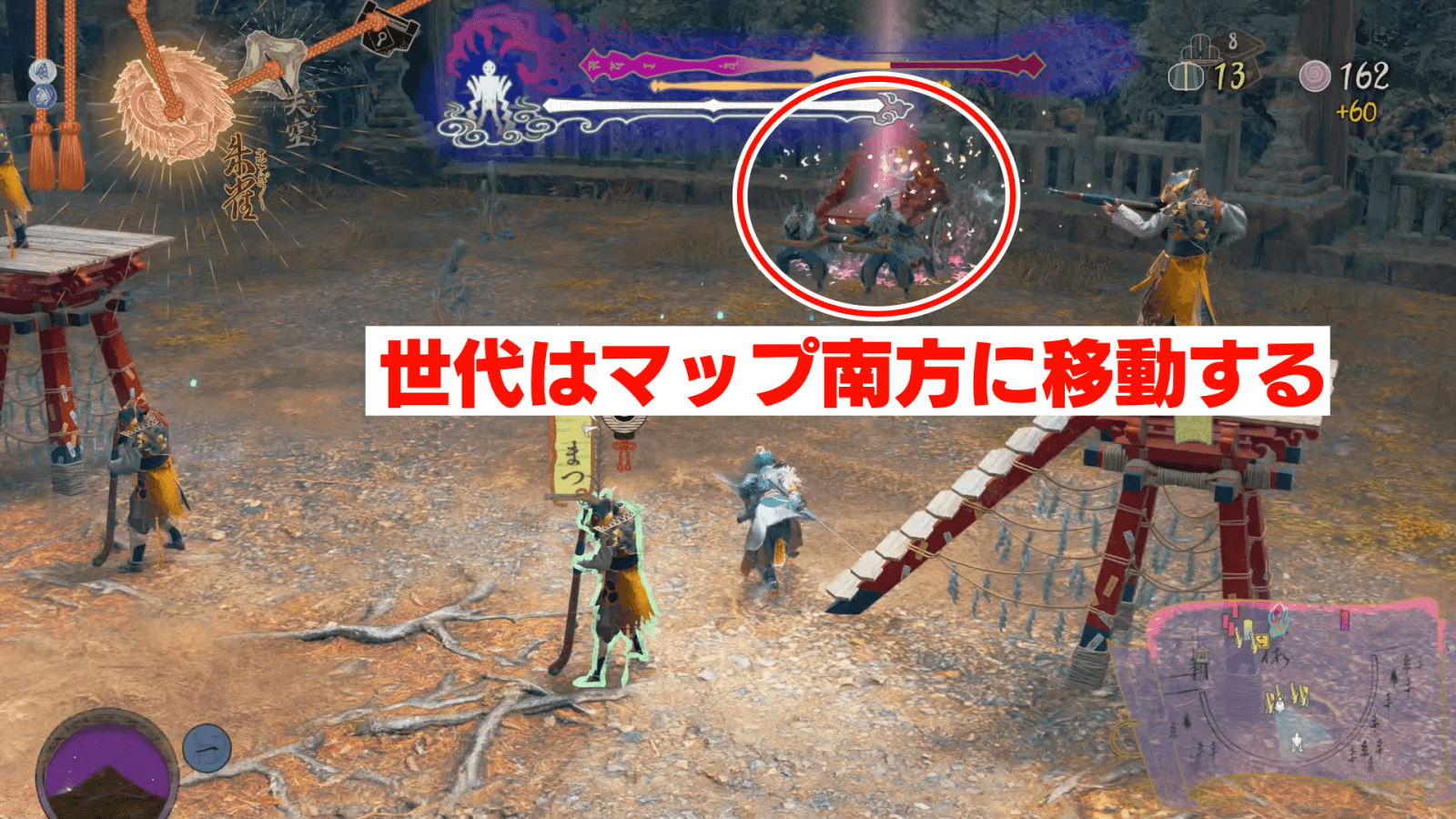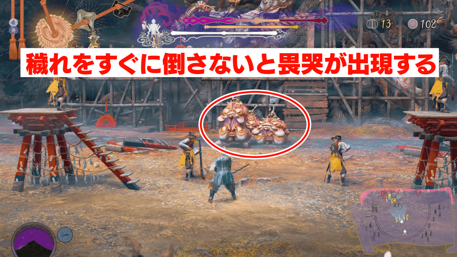 八面王のムービー後に根の生えてきた場所に発生する不浄は、太夫か移動指示で対処しよう。村人は自発的に不浄から出ようとしないため、不浄が消えるまで継続的にダメージを受けてしまう。太夫を強化していればスキルで浄化してくれるため、指示が面倒なら転職させると良い。