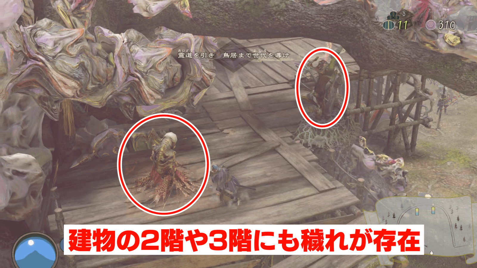 中原之大桜の穢れは、中央にある建物の上にも存在する。建物2階に村人が3人と穢れが3箇所、建物3階に穢れが2箇所存在するため、忘れずに祓っておこう。