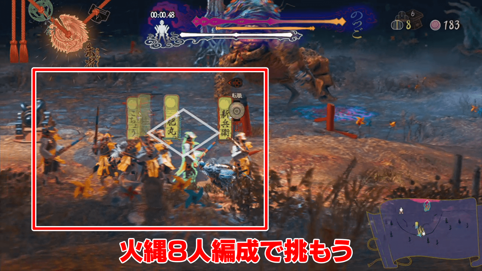 のつご戦においては、高台の中央に火縄に転職させた村人全員を配置し、戦闘開始と同時に宗の奥義「六合」で強化しよう。村人の攻撃力と行動速度を上昇させ、一気にダメージを与えれば倒しやすい。また、3分以内の撃破を狙う際は、村人の攻撃力を上げる魔像「喜怒」を装備しておくと良い。