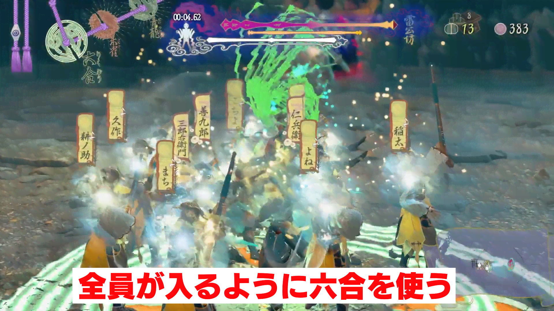 雷公坊戦で使う鍔は、村人を強化できる六合と、レジストゲージを削れる青龍や朱雀の組み合わせがおすすめ。積極的にダウンを狙うため、ダウン時に強烈な一撃を与えられる「結ノ舞」も解放しておくと良い。