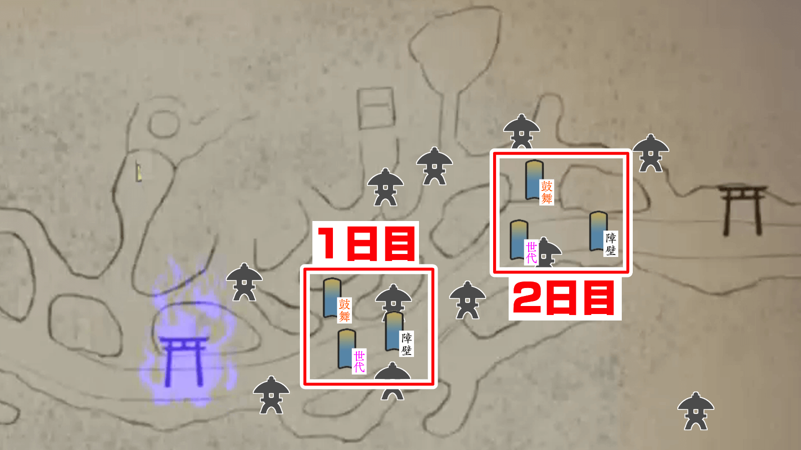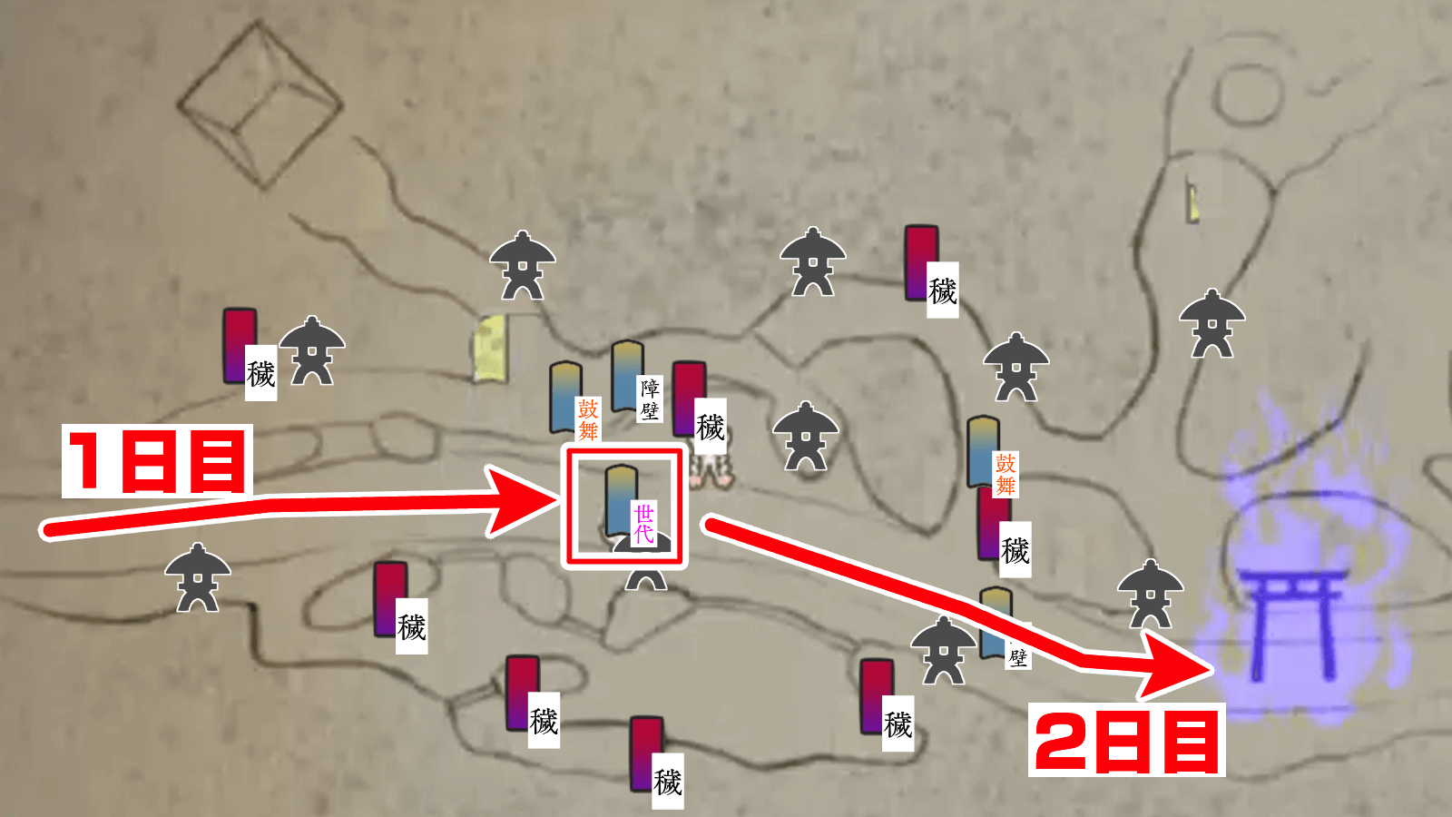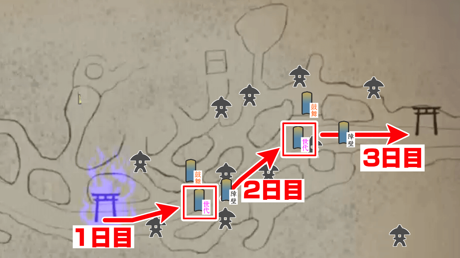 世代の進め方は、世代結界を目安に進めるのがおすすめ。穢れ鳥居までの中間辺りに世代結界があるため、結界で一度夜を迎えて2日目の昼で穢れ鳥居まで到達しよう。