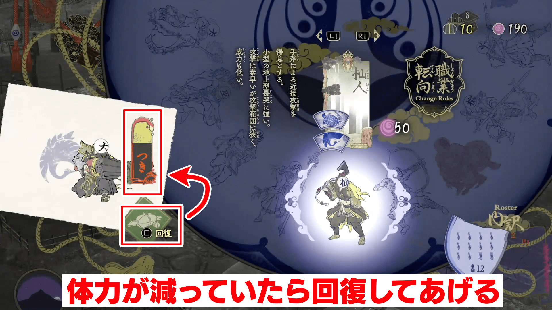 村人を一人も穢れ繭状態にしないでクリアするために、体力が減った村人をこまめに回復しよう。村人も食料で回復できるため、こまめに確認して回復してあげると良い。また、村人を回復できる巫術師や、体力が高くタンクの役割を持てる角力などを使うのもおすすめ。
