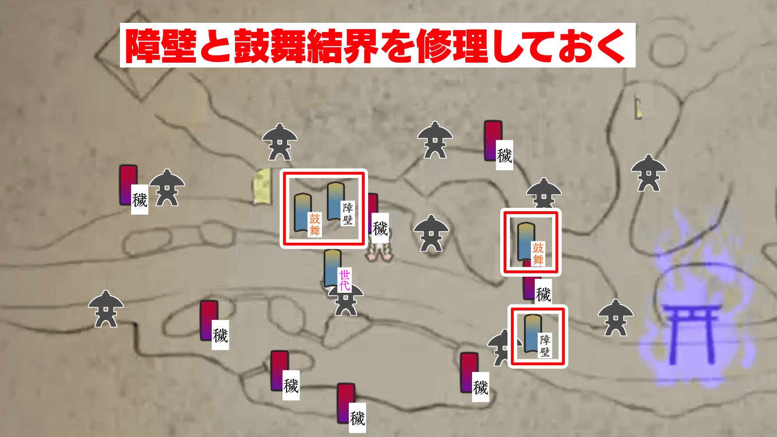 | 世代は3回に分けて穢れ鳥居まで進める世代結界の位置を目安に進める |