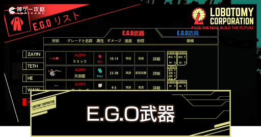 Lobotomy Corporation(ロボトミーコーポレーション)のE.G.O武器を紹介。E.G.O武器の性能も掲載しているため、Lobotomy CorporationでE.G.O武器を調べる際の参考にどうぞ。