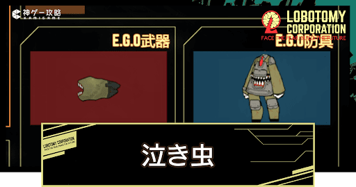 Lobotomy Corporation(ロボトミーコーポレーション)のE.G.O「泣き虫」の性能を紹介。無名の胎児から手に入るE.G.Oギフトも掲載しているので、Lobotomy CorporationでE.G.O「泣き虫」の性能を知りたい方はどうぞ。