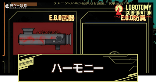 Lobotomy Corporation(ロボトミーコーポレーション)のE.G.O「ハーモニー」の性能を紹介。歌う機械から手に入るE.G.Oギフトも掲載しているので、Lobotomy CorporationでE.G.O「ハーモニー」の性能を知りたい方はどうぞ。