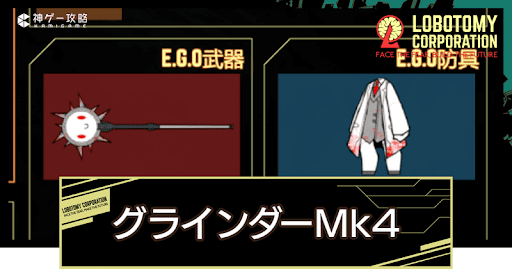 Lobotomy Corporation(ロボトミーコーポレーション)のE.G.O「グラインダーMk4」の性能を紹介。オールアラウンドヘルパーから手に入るE.G.Oギフトも掲載しているので、Lobotomy CorporationでE.G.O「グラインダーMk4」の性能を知りたい方はどうぞ。