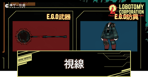 Lobotomy Corporation(ロボトミーコーポレーション)のE.G.O「視線」の性能を紹介。シャーデンフロイデから手に入るE.G.Oギフトも掲載しているので、Lobotomy CorporationでE.G.O「視線」の性能を知りたい方はどうぞ。