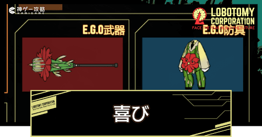 Lobotomy Corporation(ロボトミーコーポレーション)のE.G.O「喜び」の性能を紹介。ポーキュバスから手に入るE.G.Oギフトも掲載しているので、Lobotomy CorporationでE.G.O「喜び」の性能を知りたい方はどうぞ。