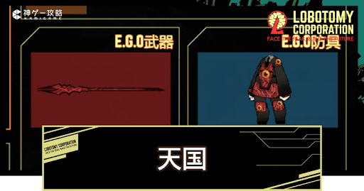 Lobotomy Corporation(ロボトミーコーポレーション)のE.G.O「天国」の性能を紹介。地中の天国から手に入るE.G.Oギフトも掲載しているので、Lobotomy CorporationでE.G.O「天国」の性能を知りたい方はどうぞ。