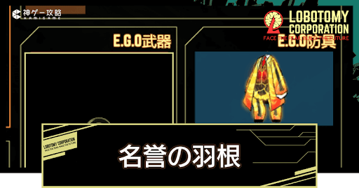 Lobotomy Corporation(ロボトミーコーポレーション)のE.G.O「名誉の羽根」の性能を紹介。火の鳥から手に入るE.G.Oギフトも掲載しているので、Lobotomy CorporationでE.G.O「名誉の羽根」の性能を知りたい方はどうぞ。